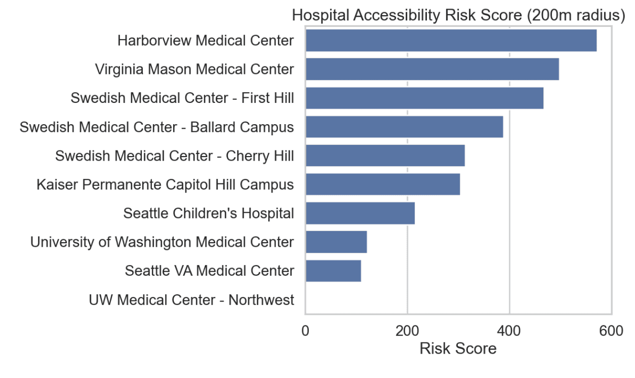 Several major hospitals are surrounded by high accessibility risk scores, indicating that reaching essential healthcare services may be difficult for people with mobility challenges. This is particularly concerning because hospitals serve populations who are more likely to rely on accessible infrastructure. The results show how sidewalk barriers translate directly into real-world access inequities.