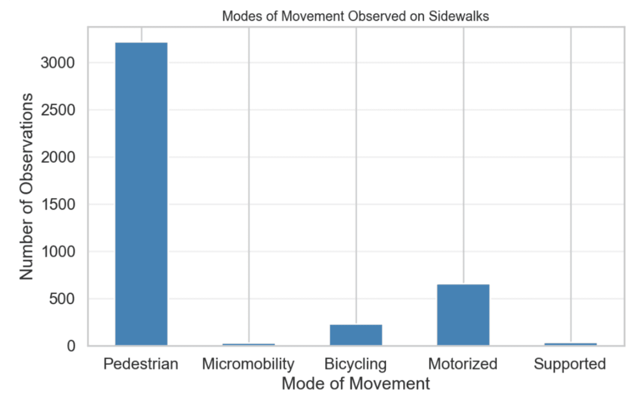 Most sidewalk users are either pedestrians or motorized, and a notable number also rely on supported mobility, micromobility, and bicycling. These modes are especially sensitive to surface conditions, curb ramps, and obstructions, meaning barriers can completely block access rather than simply slow moment–highlight why it’s so important to address sidewalk barriers.