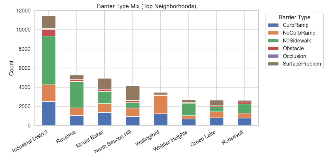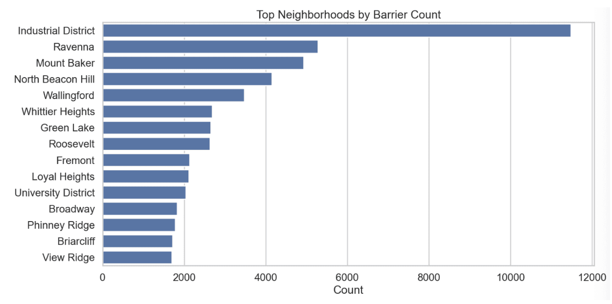 Barrier counts are unevenly distributed across neighborhoods, with areas like the Industrial District and Ravenna experiencing disproportionately high numbers. This suggests that accessibility challenges aren’t evenly shared across the city, raising concerns about geographic inequity in infrastructure quality.