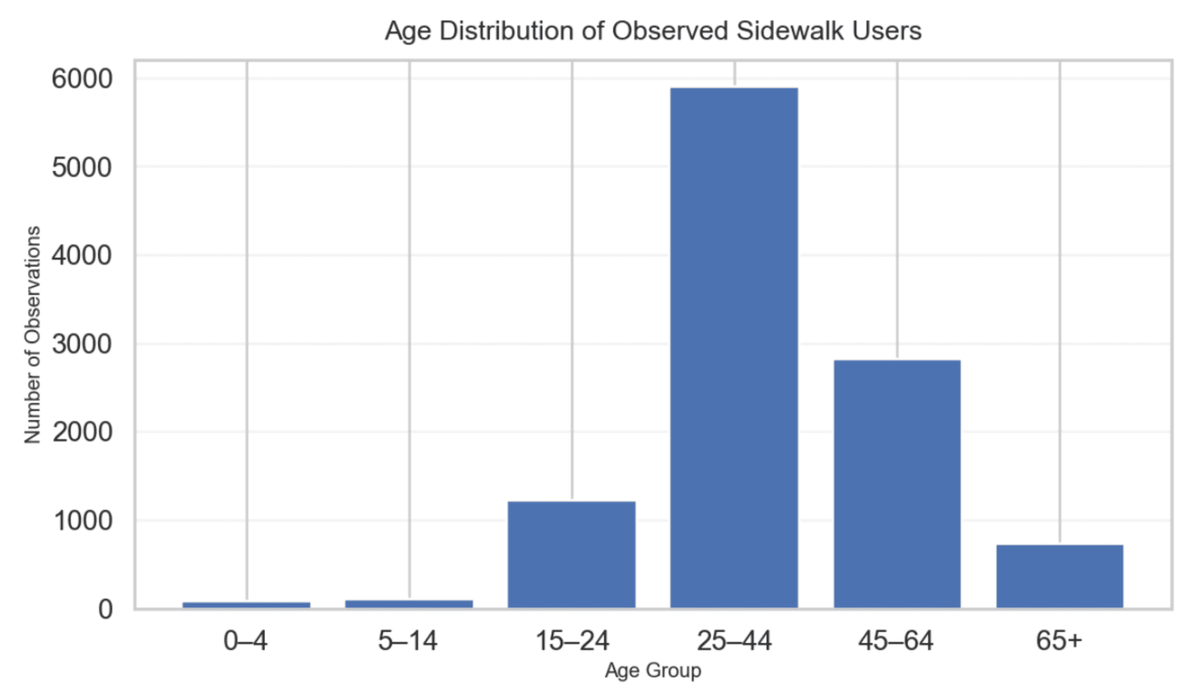 This chart demonstrates how the primary demographic of sidewalk users are working-age adults aged 25-44 and 45-64. There is also a significant number of seniors aged 65+. As older adults, who are more vulnerable to uneven infrastructure, are more likely to rely on mobility assistance, accessibility barriers disproportionately affect these populations that are already at a higher risk, making it imperative to increase sidewalk accessibility for public health and equity.