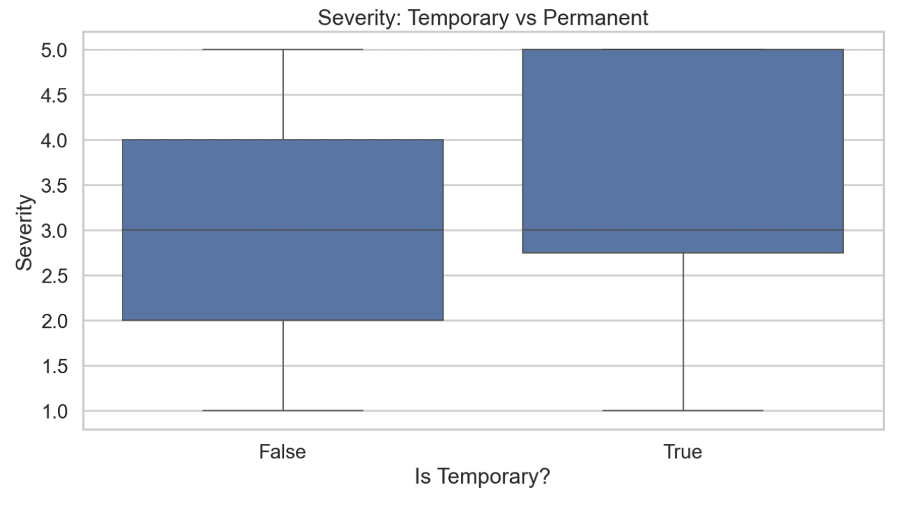 Permanent barriers tend to have equal or higher severity than temporary ones, reinforcing their long-term impact on accessibility. Unlike temporary obstacles, these barriers persist daily, compounding their effect on users who rely on accessible infrastructure.