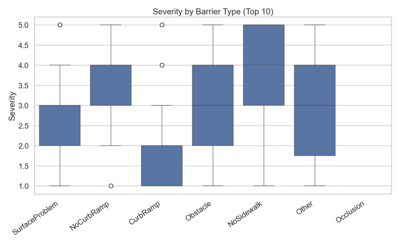 Certain barrier types, especially missing sidewalks and obstructions, show consistently higher severity scores. This indicates that the most common barriers are also amongst the most disruptive. This combination of frequency and severity makes these barrier types especially harmful to accessibility.