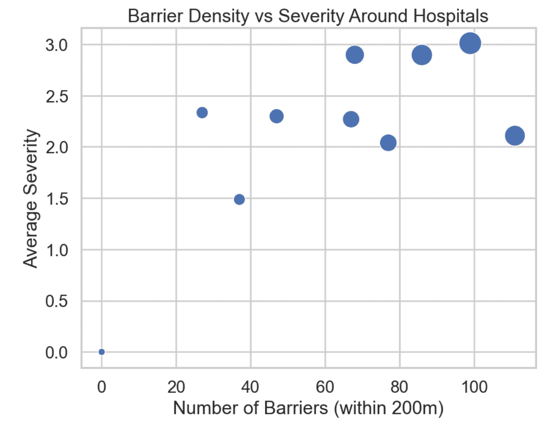 Hospitals with higher surrounding barrier counts also tend to exhibit higher average severity, compounding accessibility risks. This relationship suggests that accessibility challenges near hospitals are not isolated or trivial. This ultimately reinforces the argument that infrastructure barriers have tangible impacts on healthcare access.