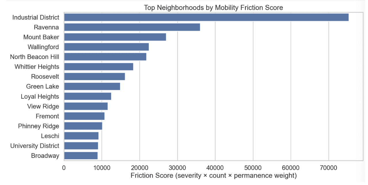 When severity and permanence are factored in, neighborhood rankings shift, revealing areas with barriers are not only numerous, but especially harmful. This metric better reflects real-world accessibility challenges rather than raw counts alone, highlighting neighborhoods where intervention would yield the greatest impact.