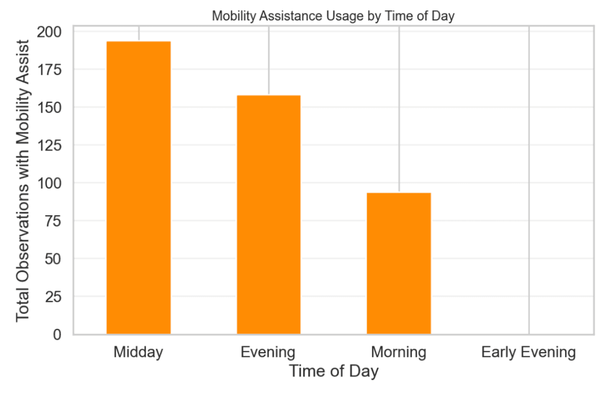 Mobility assistance usage peaks during midday and evening hours, aligning with times when people are accessing services and jobs. This suggests that accessibility barriers disproportionately affect people during active daily travel periods when sidewalk access is the most critical, leading to a higher frequency.